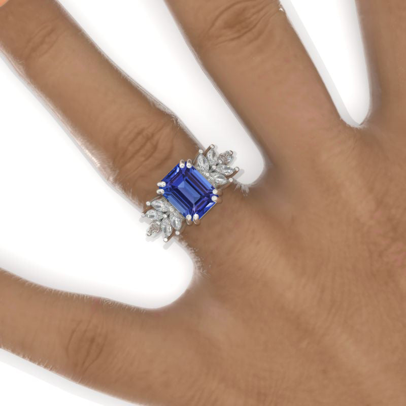 The default design option features 3 Carat 9x7mm Emerald Cut Natural Genuine Tanzanite Center Stone set with 1.2 CTW Moissanite Accent Stone: D-Colorless, VVS1-Clarity, VG-Cut, Ex-Polish, VG-Symmetry