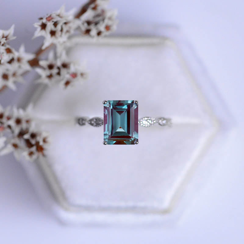 Emerald Cut Ethically LAB-Grown Alexandrite in 14K White Gold Engagement ring.