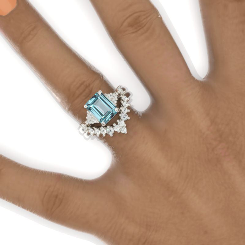 3 Carat Emerald Cut Cluster Mint Sapphire White Gold Engagement Ring Set