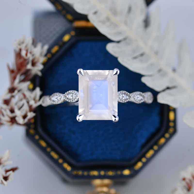 Emerald Cut Genuine Moonstone 14k White Gold Engagement ring. Model 569-9x7mm Center Stone: 3 Carat - 9x7mm Emerald Cut Clarity: VVS1 Side Stones: Moissanite Color: D Clarity: VS2-Si1 Cut: Excellent The total approximate weight of side stones: 0.1ct Shank width: 2 mm