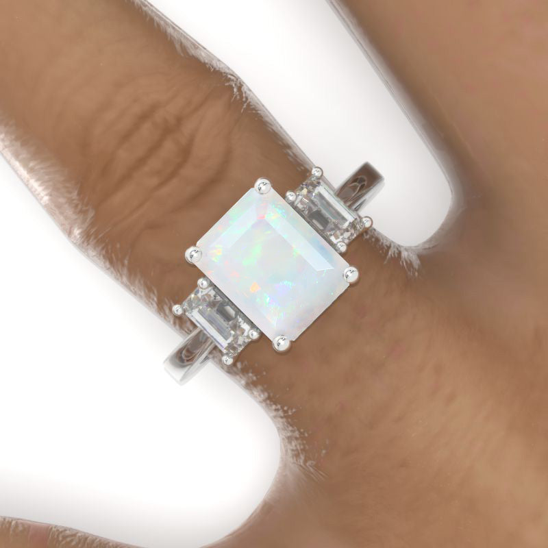 The default design option features approximately 3 Carat Genuine Natural White Opal Emerald Cut 9x7mm VVS1 Clarity, VG-Cut, Ex-Polish, VG-Symmetry Center Stone (D-Colorless)