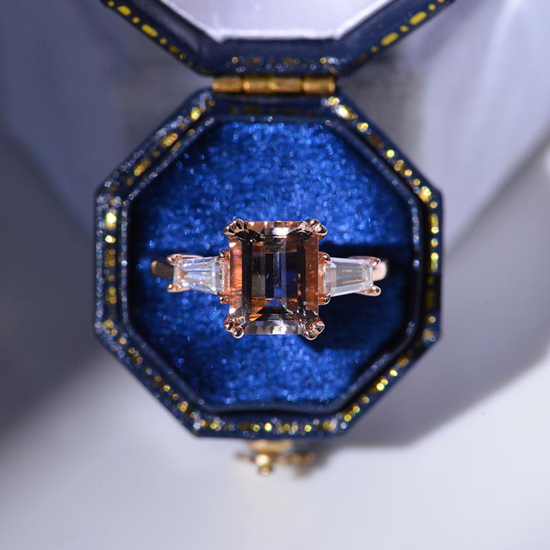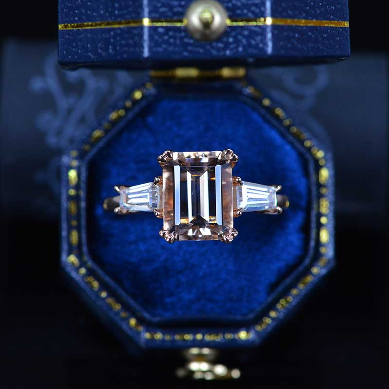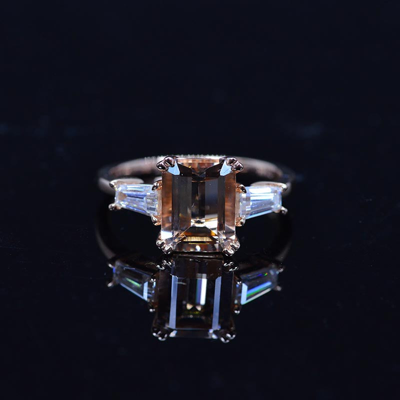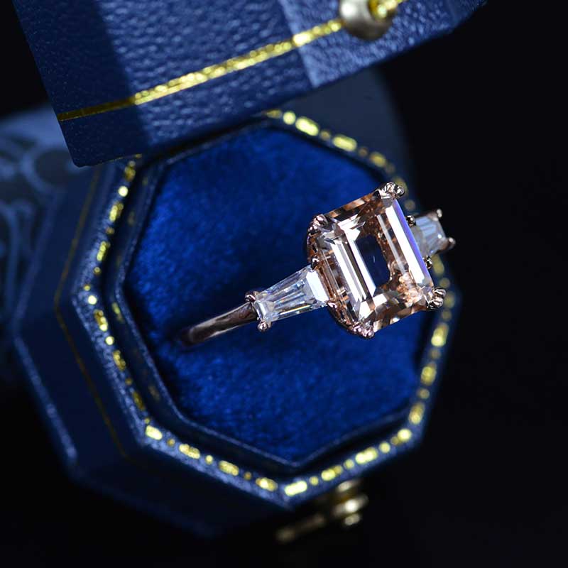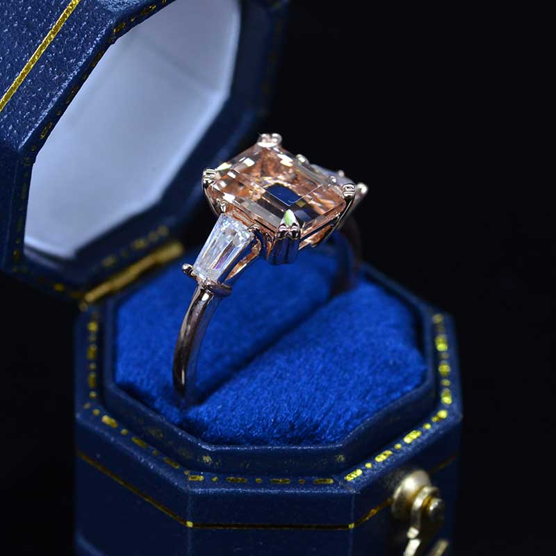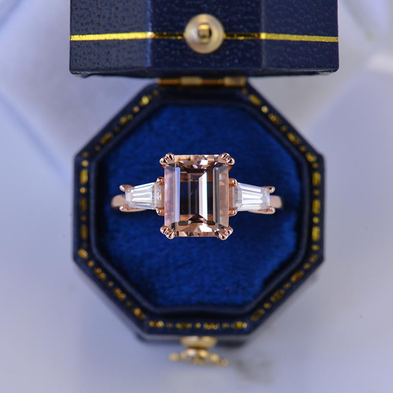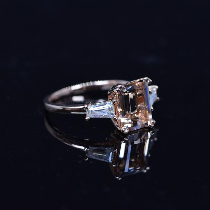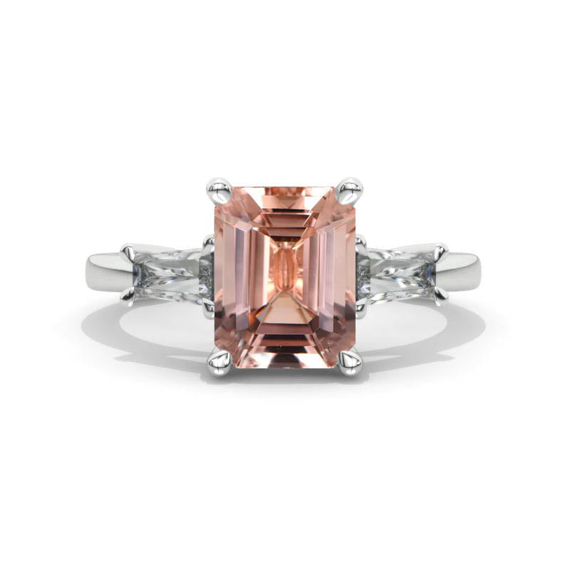The default design option features approximately 3 Carat Genuine Peach Morganite Emerald Cut 9x7mm and Moissanite Accents D-Colorless, VVS1-Clarity, VG-Cut, Ex-Polish, VG-Symmetry Center Stone set in 14K White Gold.