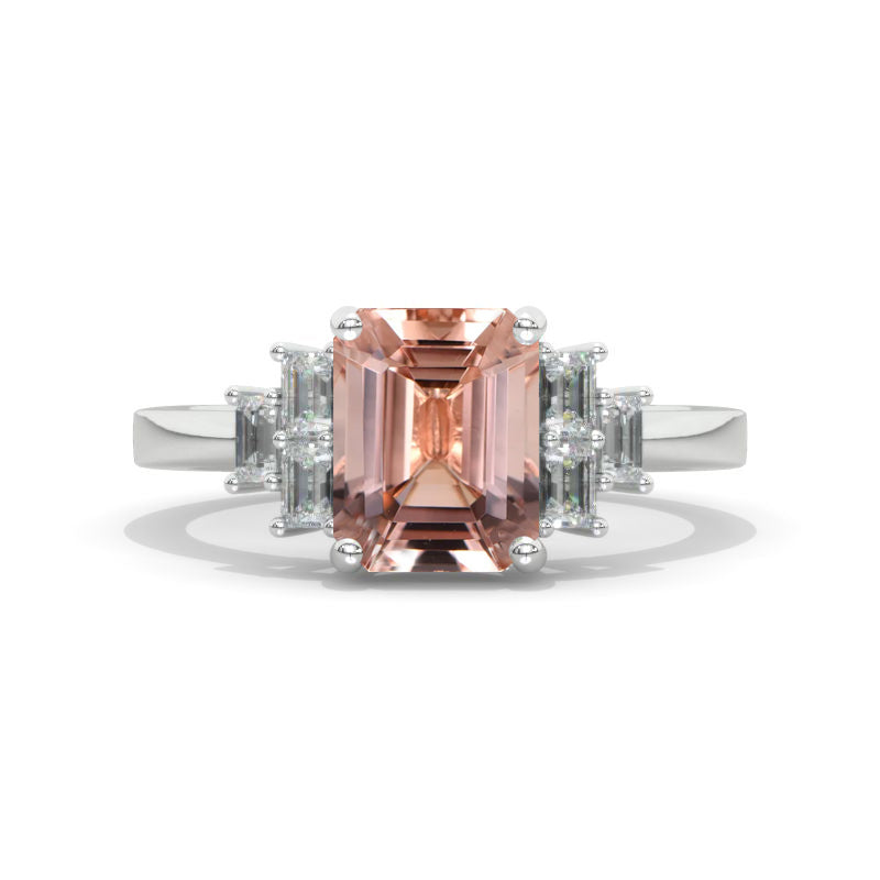 The default design option features approximately 3 Carat Genuine Peach Morganite Emerald  Cut 9x7mm VVS1 Clarity, VG-Cut, Ex-Polish, VG-Symmetry Center Stone (D-Colorless Moissanite Accents)