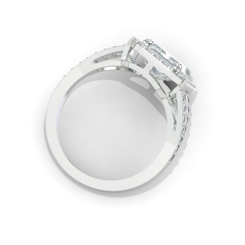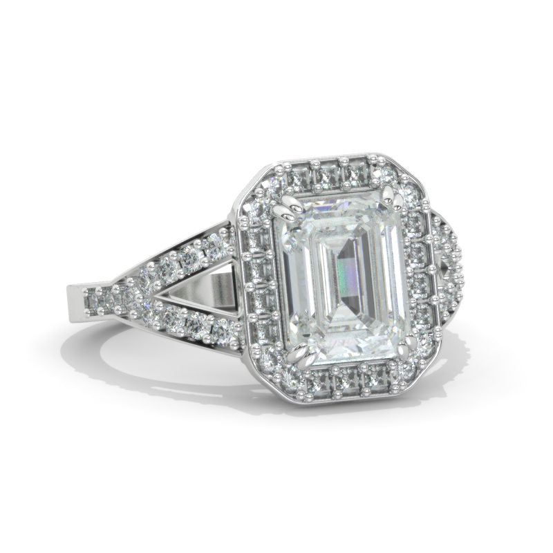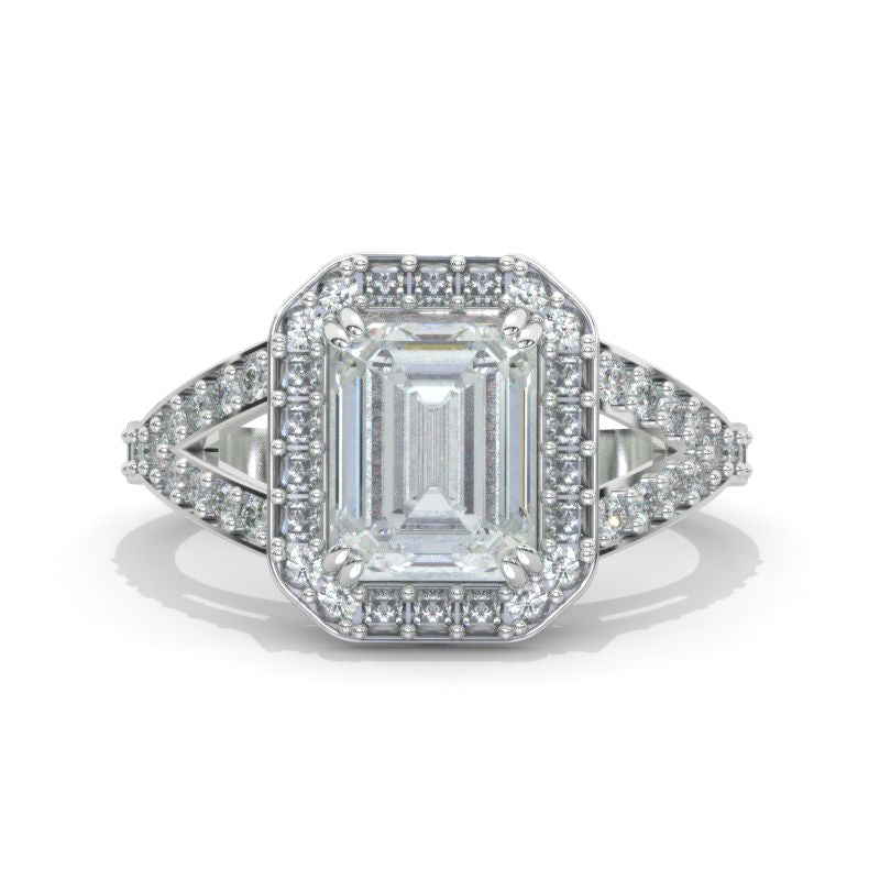 Engagement Ring: Giliarto Moissanite Emerald Cut 9x7mm D-Colorless, VVS1-Clarity, VG-Cut, Ex-Polish, VG-Symmetry Center Stone and D-Colorless Moissanite Accents in 14K White Gold Ring.