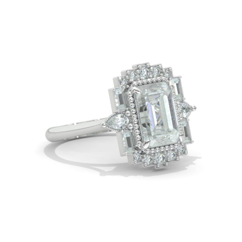 Engagement Ring: 3 Carat Moissanite Emerald Cut 10x7mm D-Colorless VVS1-Clarity, VG-Cut, Ex-Polish, VG-Symmetry Center Stone with Colorless 0.6 CTW MoissaniteÂ