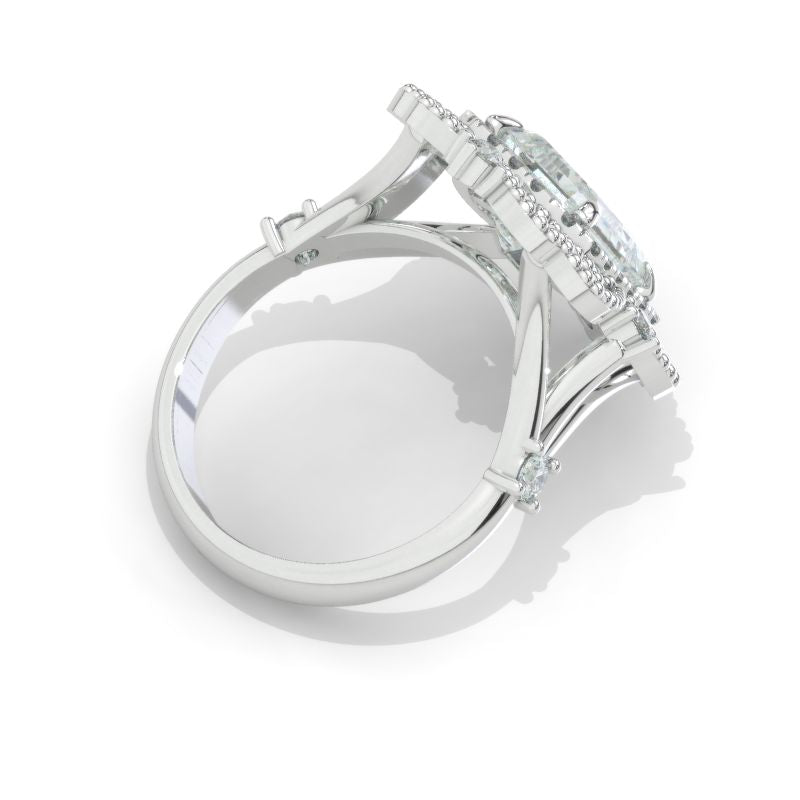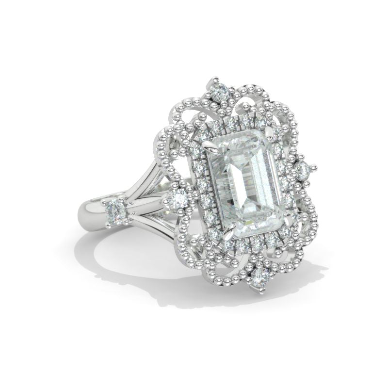 Engagement Ring: 3 Carat Moissanite Emerald Cut 10x7mm D-Colorless VVS1-Clarity, VG-Cut, Ex-Polish, VG-Symmetry Center Stone with Colorless 0.4 CTW MoissaniteÂ