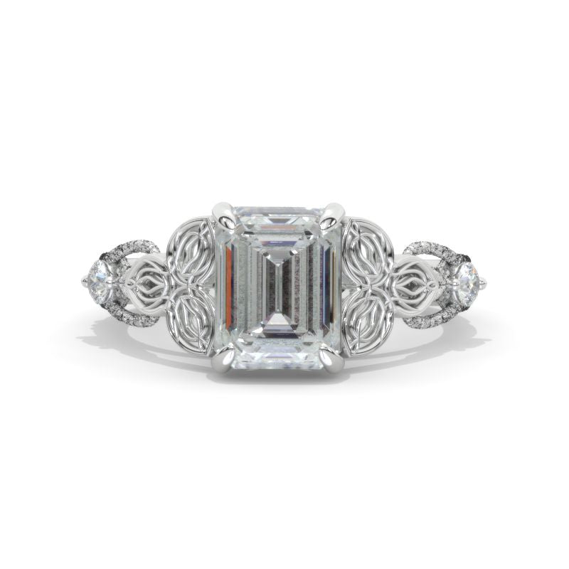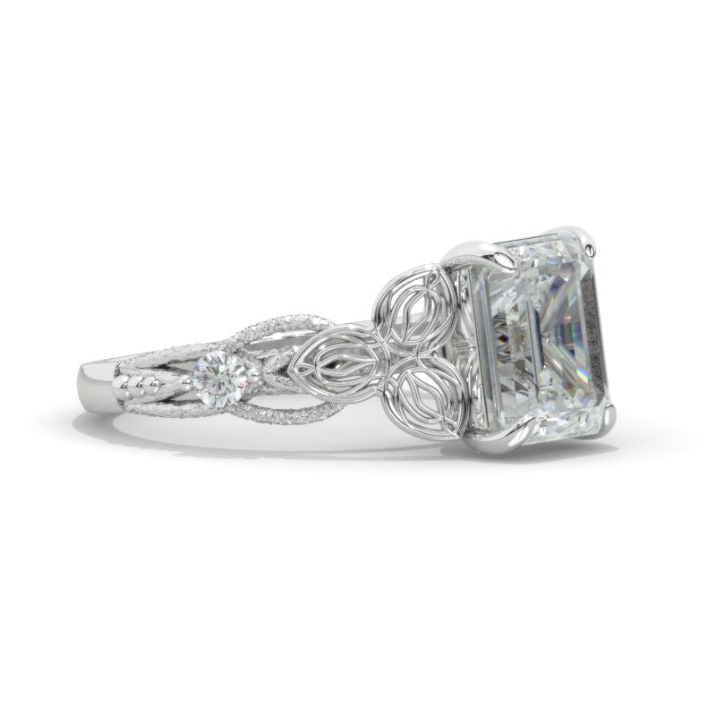 3 Carat Moissanite Center Stone Emerald Cut 9x7mm D-Colorless, VVS1-Clarity, VG-Cut, Ex-Polish, VG-Symmetry Center Stone and Moissanite Accents