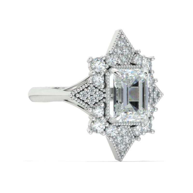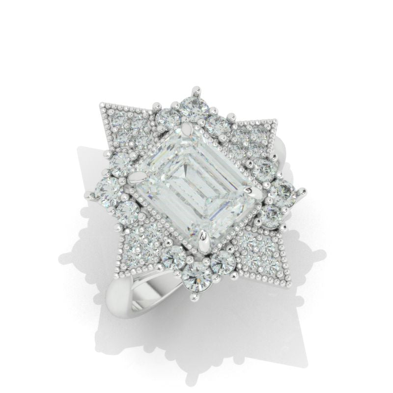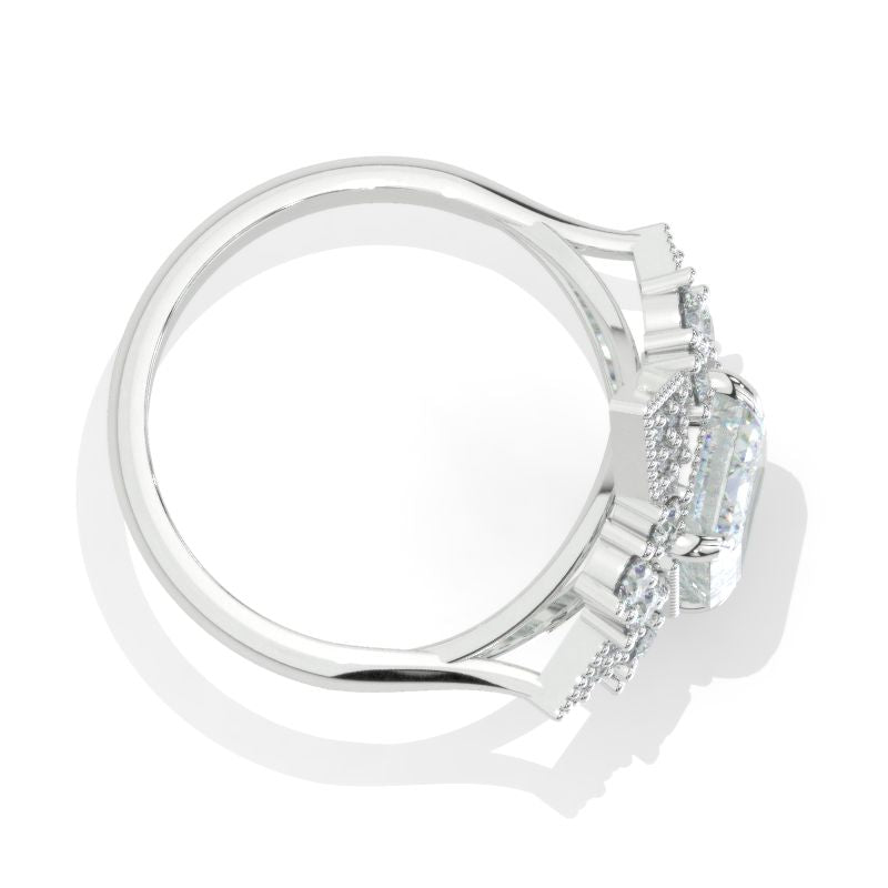 The default design option features 3 Carat 9x7mm Emerald Cut Giliarto Moissanite Center Stone and Moissanite Accents D-Colorless, VVS1-Clarity, VG-Cut, Ex-Polish, VG-Symmetry