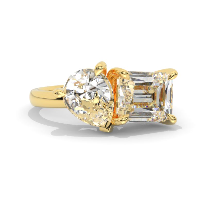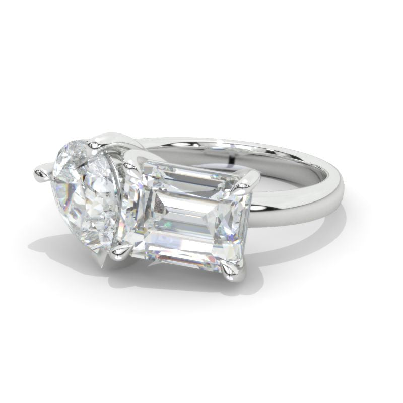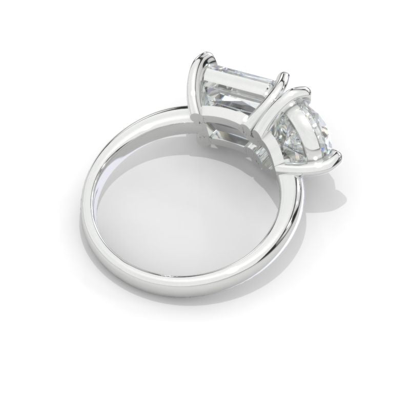 The default design option features approximately 3+ Carat LAB-Grown Diamond Emerald Cut 9x7mm and 2 Carat 9x7mm Pear Cut D-Colorless, VVS1-Clarity,VG-Cut,Ex-Polish, VG-Symmetry Center Stone set with D- Colorless LAB-Grown Diamond Accent Stones in 14K White Gold.