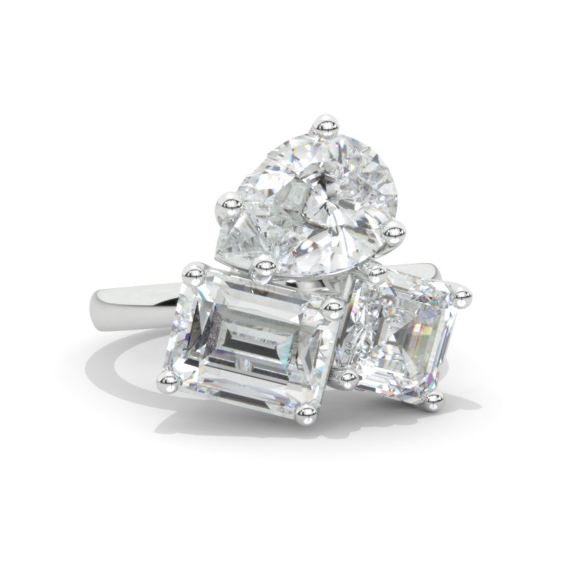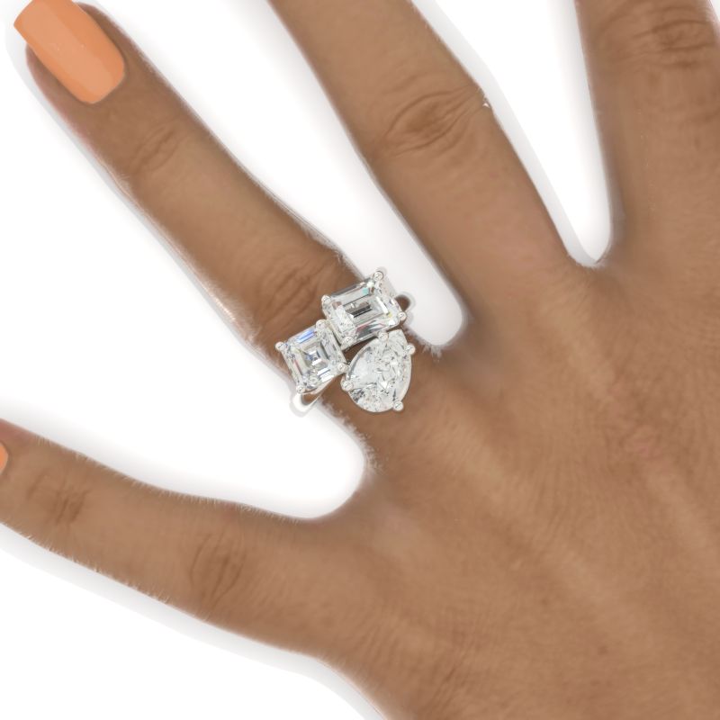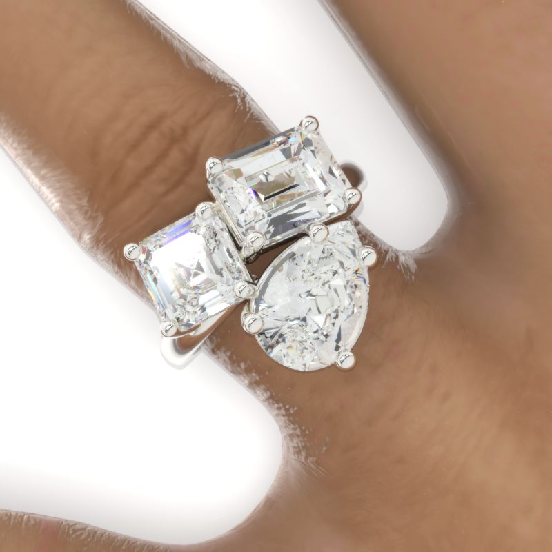 The default design option features approximately 3+ Carat LAB-Grown Diamond Emerald Cut 9x7mm and 2 carat 9x7mm Pear Cut and 7x7 mm Asscher 2 Carat D-Colorless, VVS1-Clarity,VG-Cut,Ex-Polish, VG-Symmetry Center Stone
