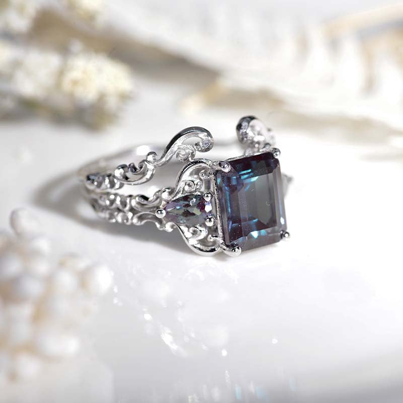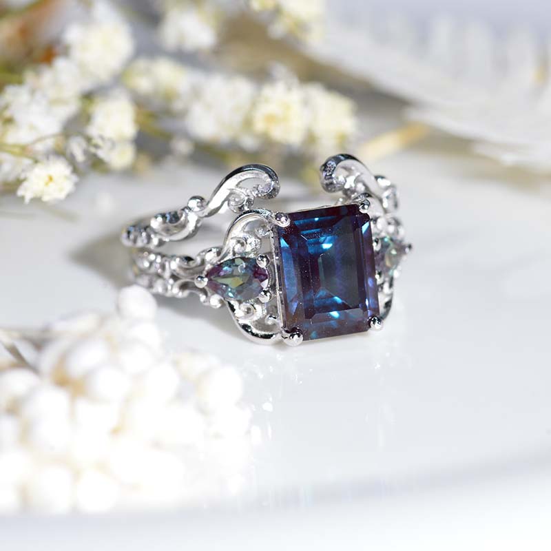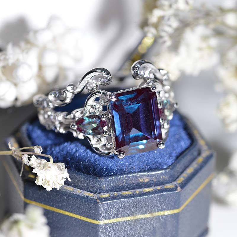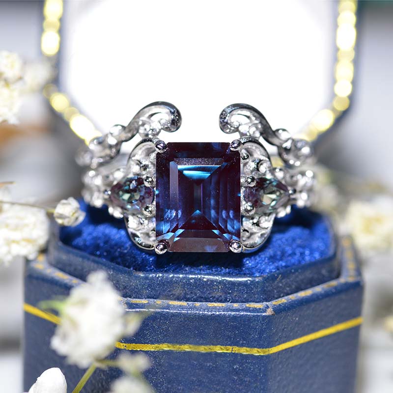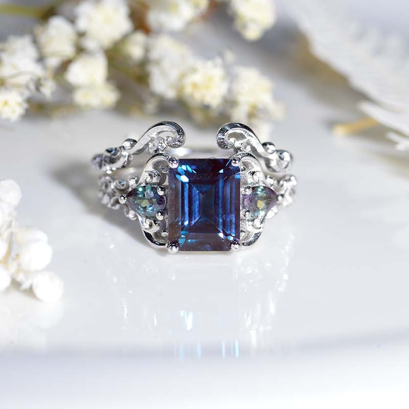 The default design option features 3 Carat 9x7mm Emerald Cut Ethically Lab-Grown Alexandrite Center Stone set with 0.8 CTW  Moissanite Accent Stone: D-Colorless, VVS1-Clarity, VG-Cut, Ex-Polish, VG-Symmetry