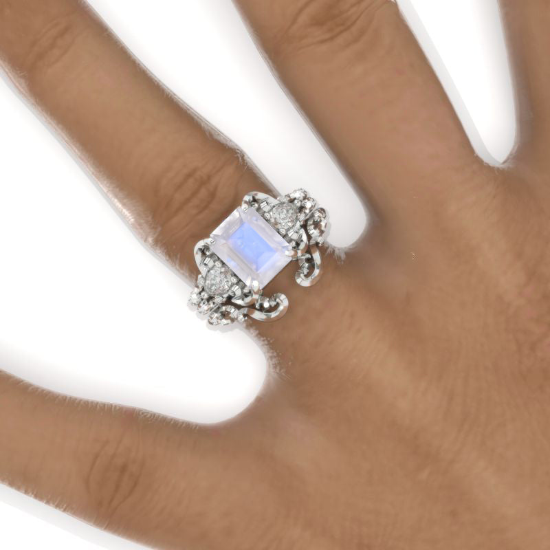 The default design option features 3 Carat 9x7mm Emerald Cut Genuine Natural Moonstone Center Stone set with 0.8 CTW Moissanite Accent Stone: VG-Cut, Ex-Polish, VG-Symmetry