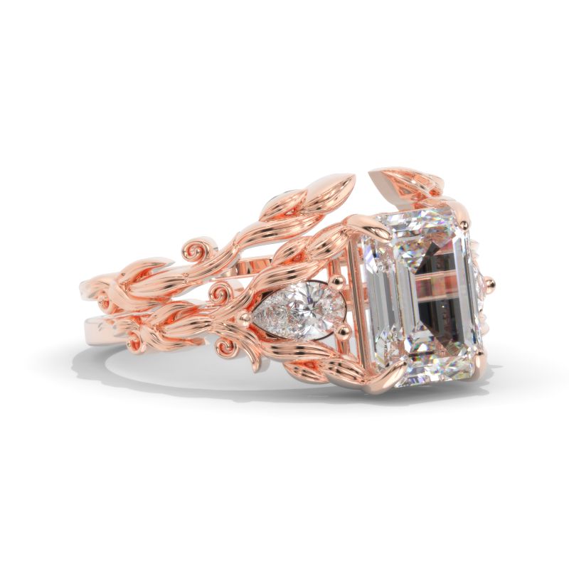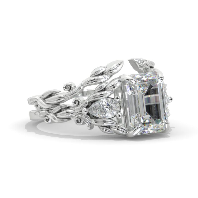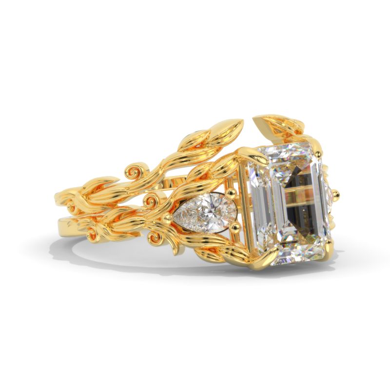 The default design option features 3 Carat 9x7mm Emerald Cut Giliarto Moissanite Center Stone set with 0.8 CTW Moissanite Accent Stone: D-Colorless, VVS1-Clarity, VG-Cut, Ex-Polish, VG-Symmetry