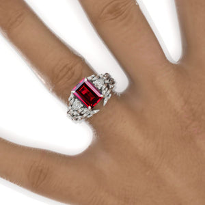 The default design option features 3 Carat 9x7mm Emerald Cut Ethically Lab-Grown Ruby AAA+ Grade Center Stone set with 0.8 CTW Moissanite Accent Stone: D-Colorless, VVS1-Clarity, VG-Cut, Ex-Polish, VG-Symmetry