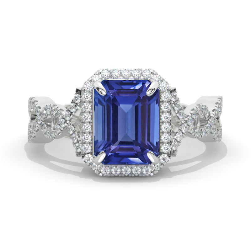 The default design option features 3 Carat 9x7mm Emerald Cut Natural Genuine Tanzanite Center Stone set with 1.2 CTW Moissanite Accent Stone: D-Colorless, VVS1-Clarity, VG-Cut, Ex-Polish, VG-Symmetry