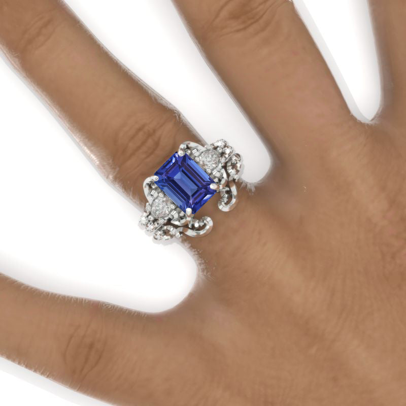 The default design option features 3 Carat 9x7mm Emerald Cut Natural Genuine Tanzanite Center Stone set with 0.8 CTW Moissanite Accent Stone: D-Colorless, VVS1-Clarity, VG-Cut, Ex-Polish, VG-Symmetry