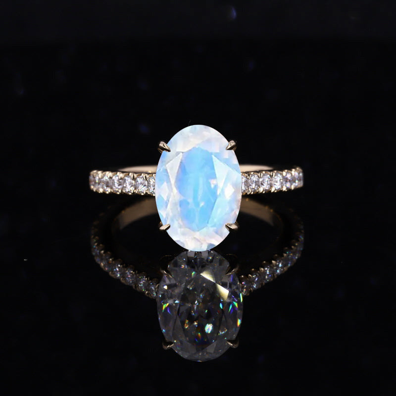 3 Carat Genuine Moonstone Oval Cut Hidden Halo Rose Gold Engagement Ring
