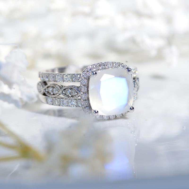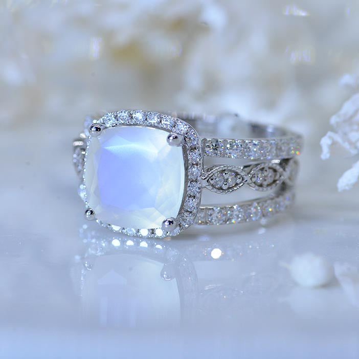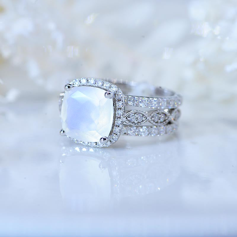 Engagement Ring Approximately 3 Carat Genuine Natural Moonstone Cushion Shape 9x9mm VG-Cut, Ex-Polish, VG-Symmetry Center Stone with Colorless 0.3 CTW Moissanite