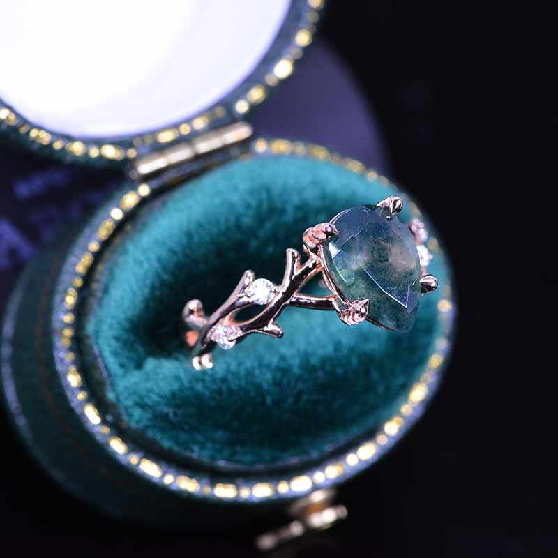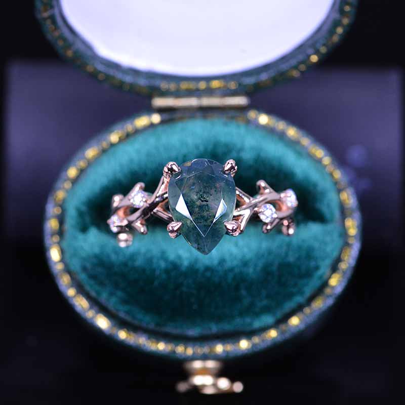 The default design option features 10x7mm Pear Cut Natural Moss Agate Center Stone, VG-Cut, Ex-Polish, VG-Symmetry
