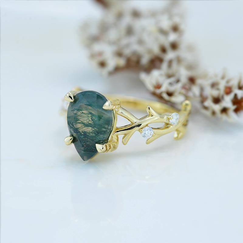 3 Carat Genuine Pear Cut Moss Agate Twig Floral White Gold Engagement - Giliarto