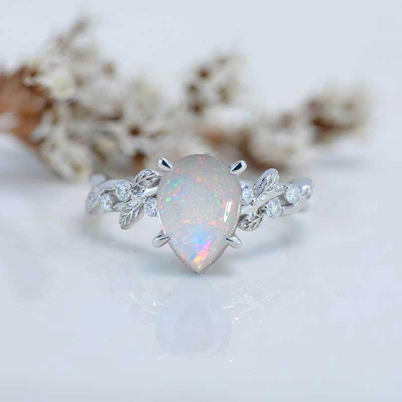 3 Carat Genuine White Opal Pear Cut Floral White Gold Engagement Ring - Giliarto