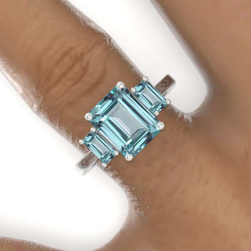 The default design option features approximately 3 Carat Ethically Lab-Grown Mint Sapphire Emerald Cut 9x7mm Mint color, VG-Cut, Ex-Polish, VG-Symmetry Center Stone (D-Colorless) set with D- Colorless Moissanite Accent Stones