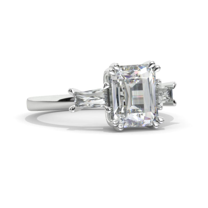 The default design option features approximately 3 Carat Giliarto Moissanite Emerald Cut 9x7mm D-Colorless, VVS1-Clarity,VG-Cut,Ex-Polish, VG-Symmetry Center Stone Set with Colorless Moissanite Accent stones