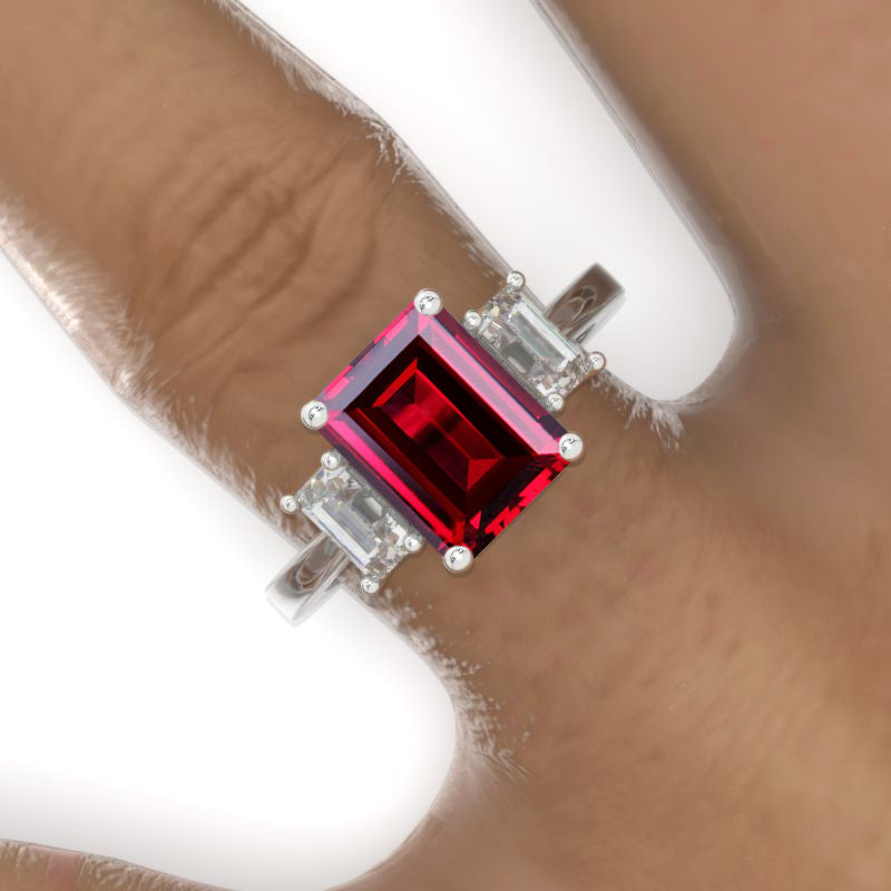 The default design option features approximately 3 Carat Ethically Lab-Grown Ruby AAA+ Grade Emerald  Cut 9x7mm VG-Cut, Ex-Polish, VG-Symmetry Center Stone (D-Colorless) set with D- Colorless Moissanite Accent Stones