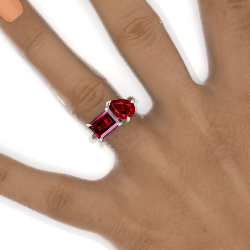 The default design option features approximately 3 Carat Ethically Lab-Grown Ruby AAA+ Grade Emerald Cut 9x7mm and 2 Carat 9x7mm Pear Cut VG-Cut,Ex-Polish, VG-Symmetry Center Stone set with D- Colorless Moissanite Accent Stones in 14K White Gold.