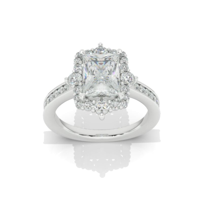 The default design option features approximately 3 Carat Giliarto Moissanite Cut 9x7mm D-Colorless, VVS1-Clarity,VG-Cut,Ex-Polish, VG-Symmetry Center Stone (Colorless) with Moissanite Accents Stones set in 14K White Gold.