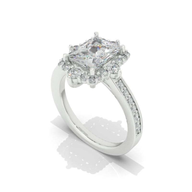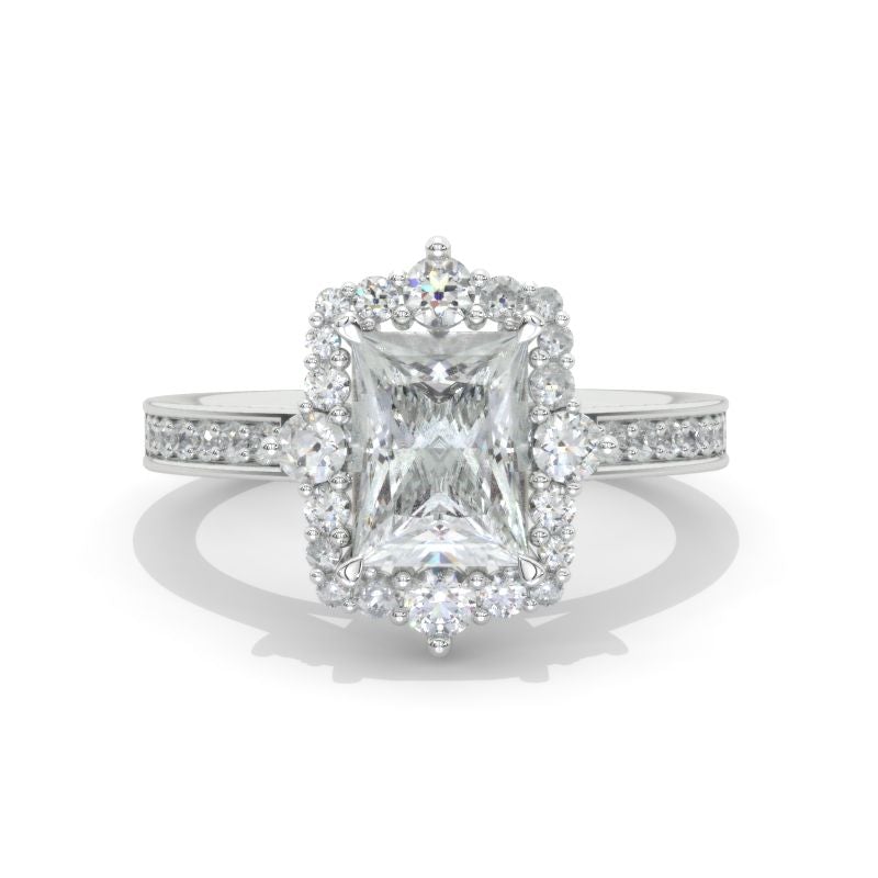 The default design option features approximately 3 Carat Giliarto Moissanite Radiant Cut 9x7mm D-Colorless, VVS1-Clarity,VG-Cut,Ex-Polish, VG-Symmetry Center and Accents Stones.