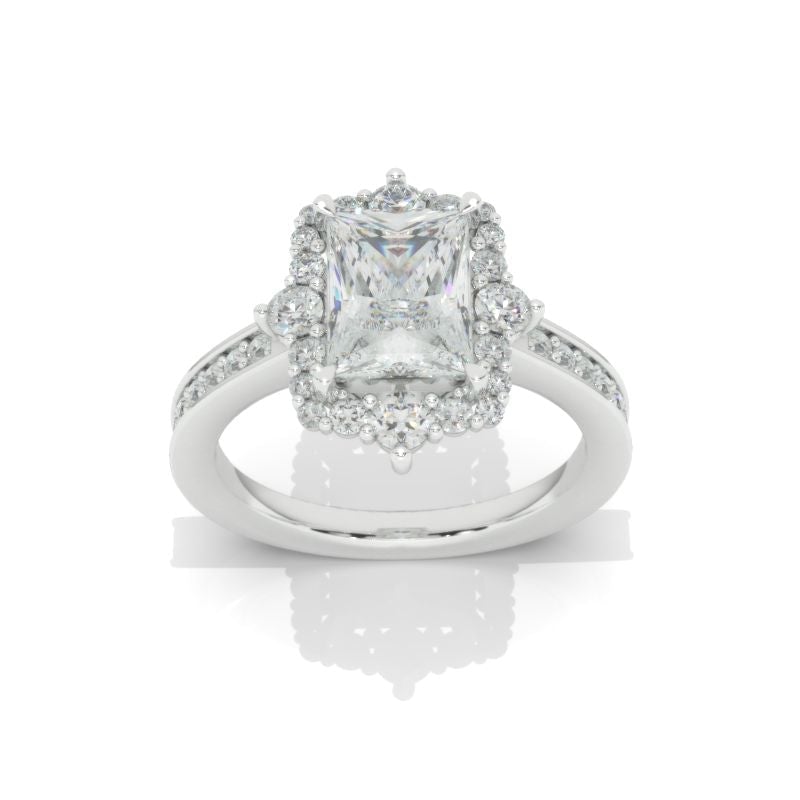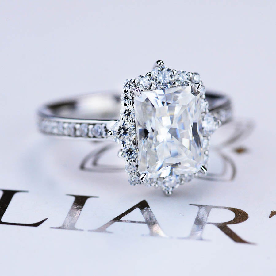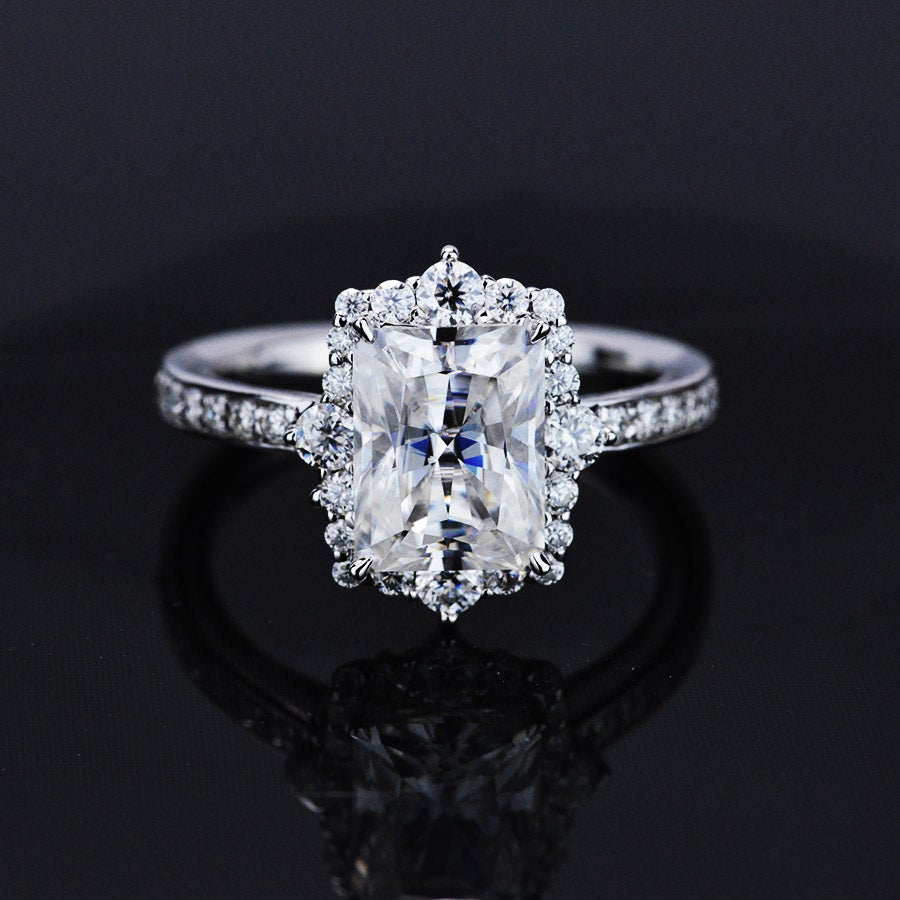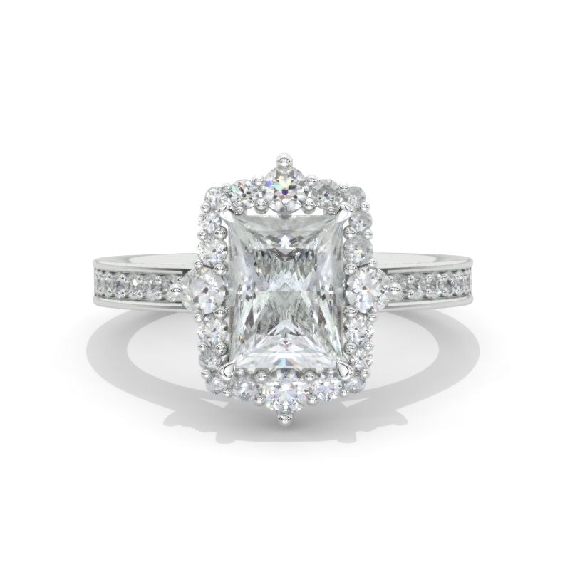 The default design option features approximately 3 Carat Giliarto Moissanite Radiant Cut 9x7mm D-Colorless, VVS1-Clarity,VG-Cut,Ex-Polish, VG-Symmetry Center Stone