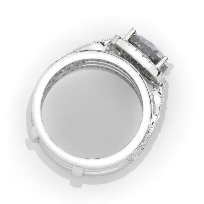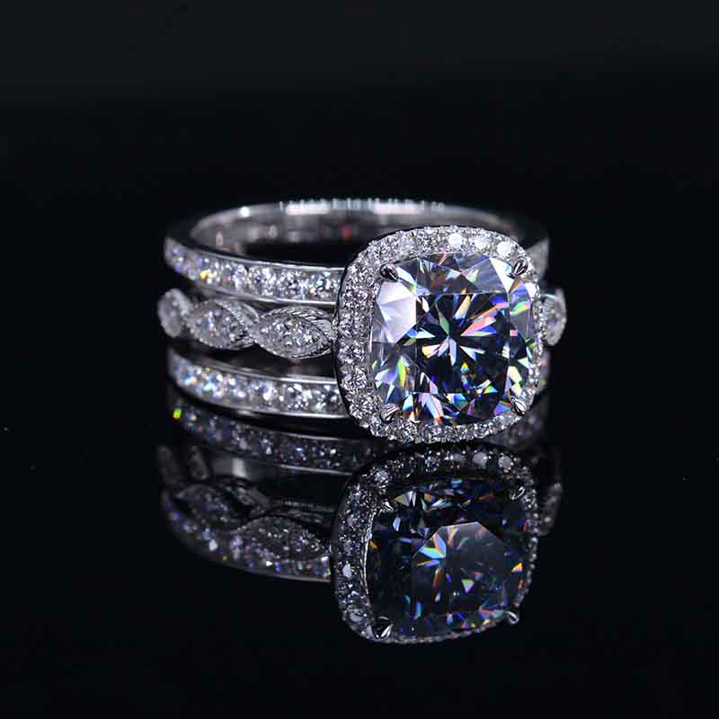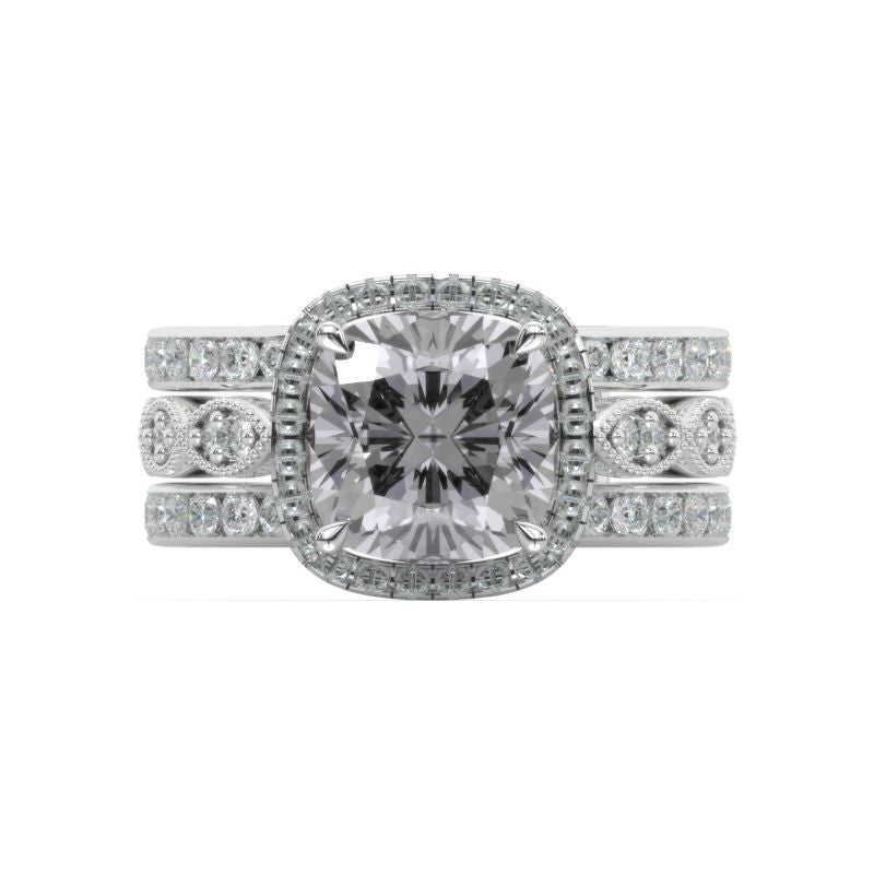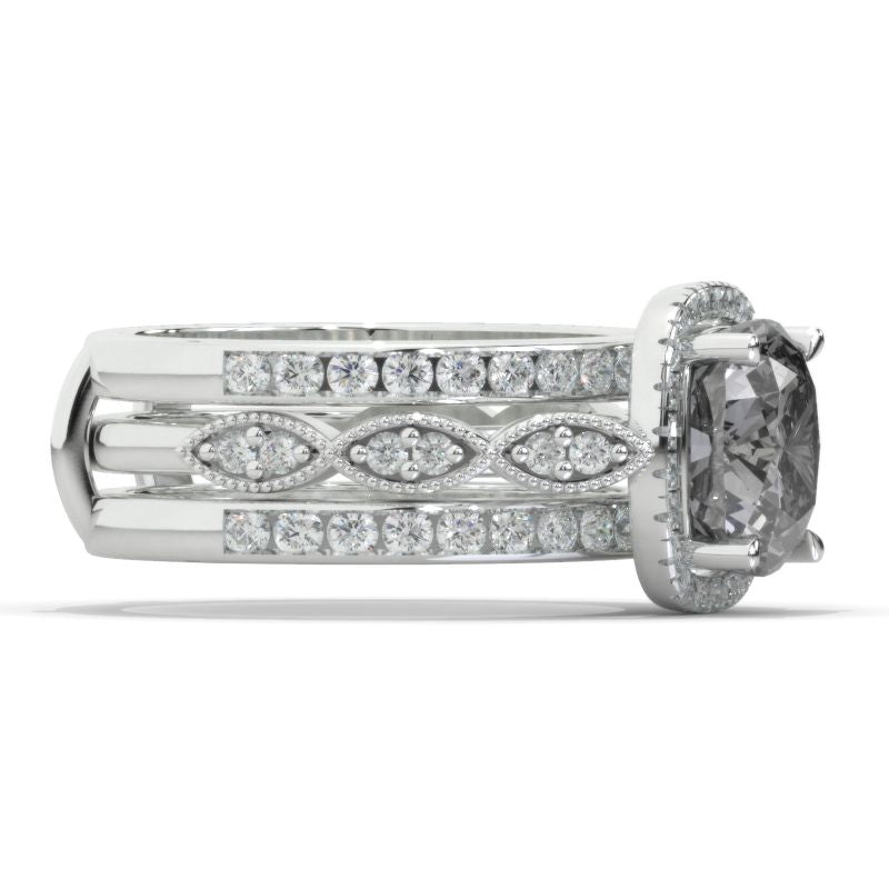 Engagement Ring Approximately 3 Carat Gray Moissanite Cushion Shape 9x9mm VVS1-Clarity, VG-Cut, Ex-Polish, VG-Symmetry Center Stone with Colorless 0.3 CTW Diamond