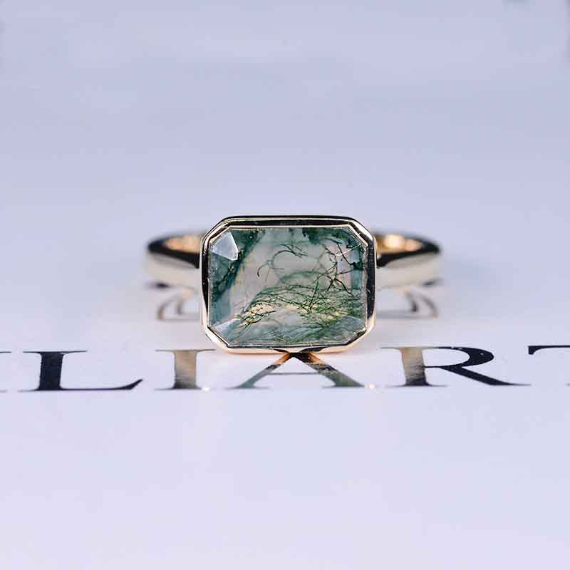 The default design option features  9x7mm Emerald Cut Green Moss Agate stone
