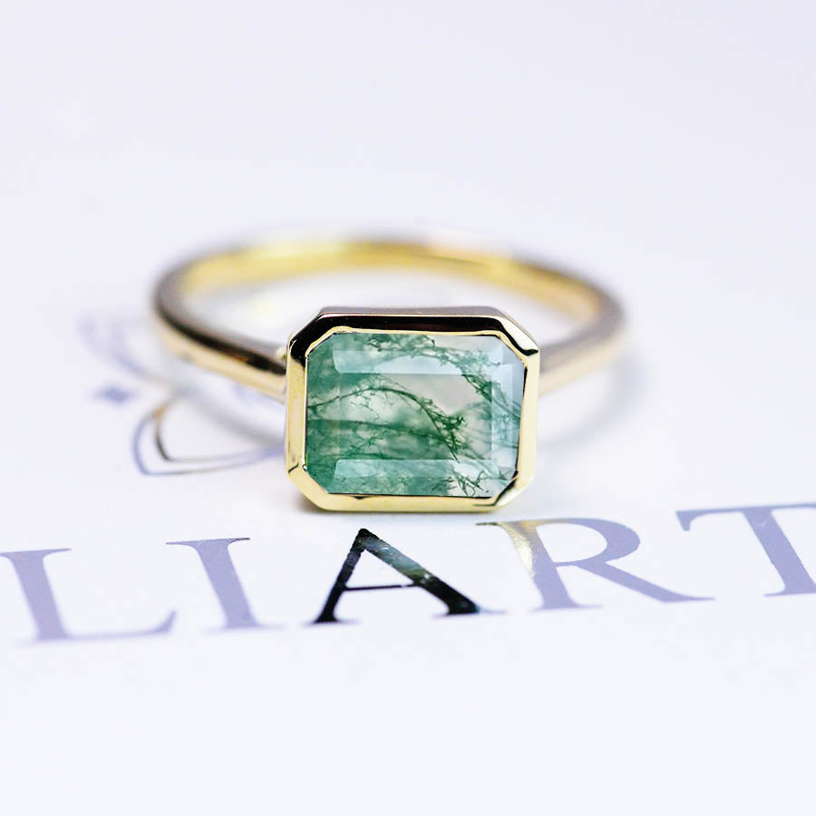 3 Carat Green Moss Agate Engagement Ring, Bezel Set Emerald Cut Moss A - Giliarto