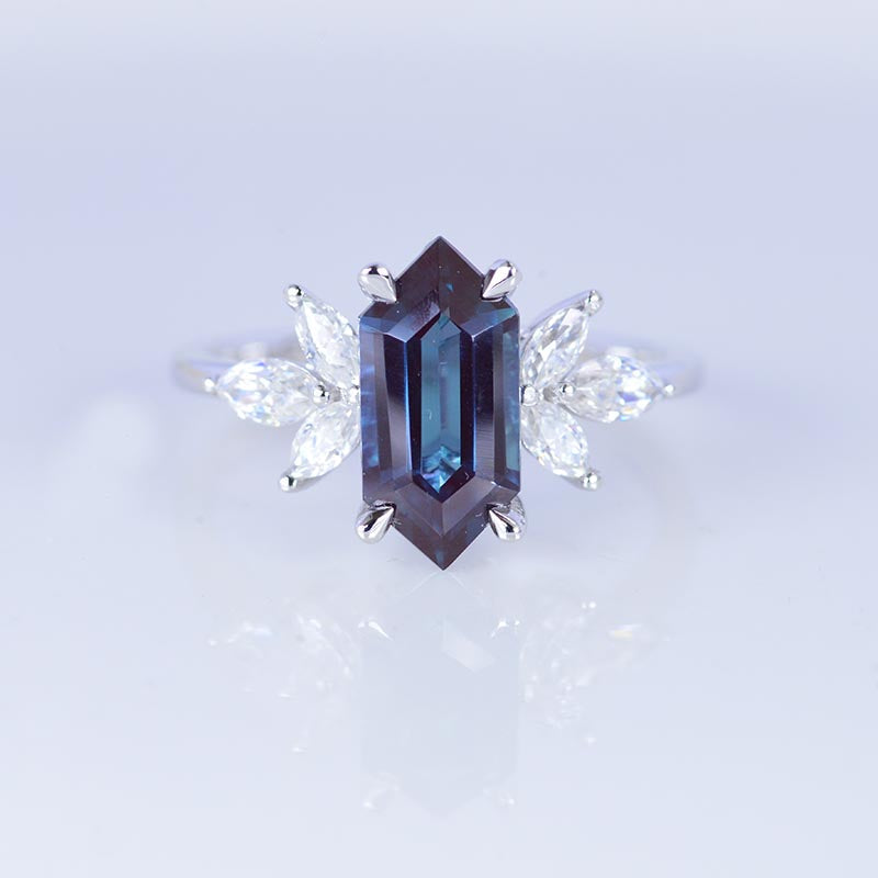 Engagement Ring 3 Carat Ethically LAB-Grown Alexandrite Hexagon 12x6mm VVS1-Clarity, VG-Cut, Ex-Polish, VG-Symmetry Center Stone with 38 Colorless 0.5 CTW Moissanite