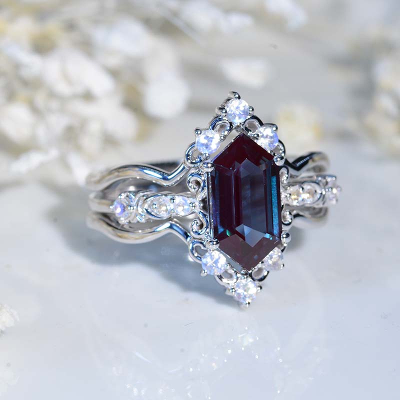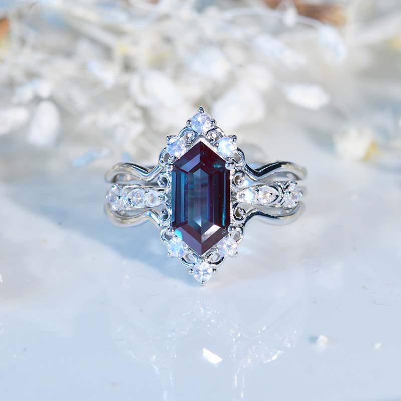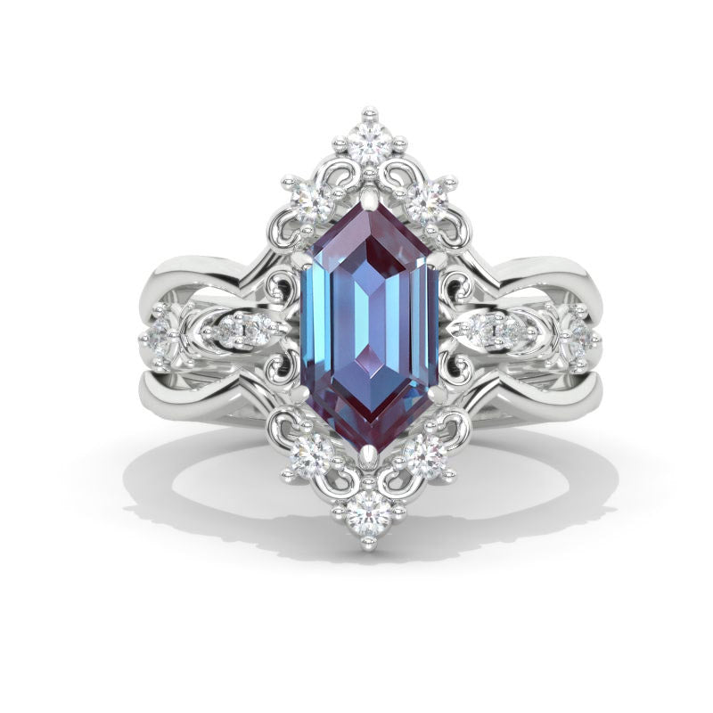 3 Carat Hexagon Alexandrite Cluster Halo 14K White Gold Engagement Ring Set Model 931