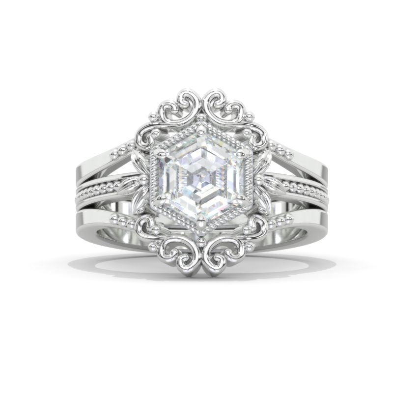 Engagement Ring: Approximately 3+ Carat LAB-Grown Diamond Hexagon 8mm D-Colorless, VVS1-Clarity, VG-Cut, Ex-Polish, VG-Symmetry Center Stone set with D- Colorless LAB-Grown Diamond Accent Stones in 14K White Gold Ring.