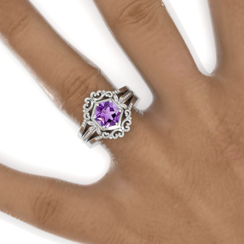 Engagement Ring: 3 Carat Genuine Natural Amethyst- AAAA Grade Hexagon 8mm VG-Cut, Ex-Polish, VG-Symmetry Center Stone set with D- Colorless Moissanite Accent Stones in 14K White Gold Ring.