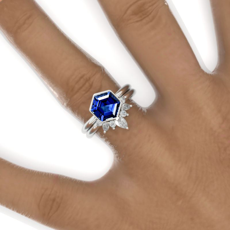 Engagement Ring: 3 Carat Ethically Cultivated Royal Blue Color Sapphire , Grade: AAA+ Hexagon 8mm VG-Cut, Ex-Polish, VG-Symmetry Center Stone set with D- Colorless Moissanite Accent Stones in 14K White Gold Ring.