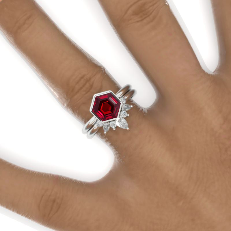 Engagement Ring: 3 Carat Giliarto Ethically Lab-Grown Ruby AAA+ Grade Hexagon 8mm VG-Cut, Ex-Polish, VG-Symmetry Center Stone set with D- Colorless Moissanite Accent Stones in 14K White Gold Ring.