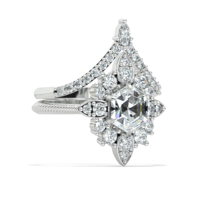 Engagement Ring: Approximately 3+ Carat LAB-Grown Diamond Hexagon 8mm D-Colorless, VVS1-Clarity, VG-Cut, Ex-Polish, VG-Symmetry Center Stone and LAB-Grown Diamond D-Colorless, VVS1-Clarity, Accents Stones in 14K White Gold Ring.
