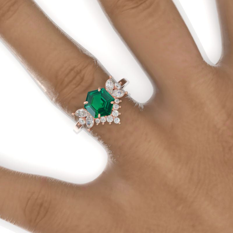 3 Carat Hexagon Emerald Cluster Halo 14K White Gold Engagement Ring Model 911-8x7 hex