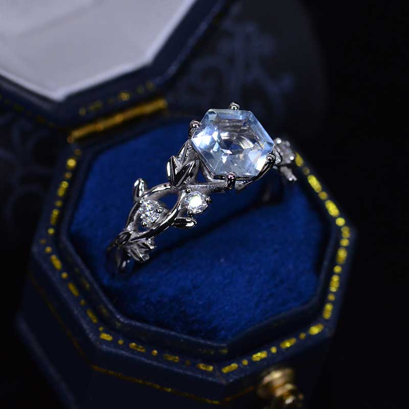 3 Carat Hexagon Genuine Aquamarine Floral 14K White Gold Engagement Ri - Giliarto