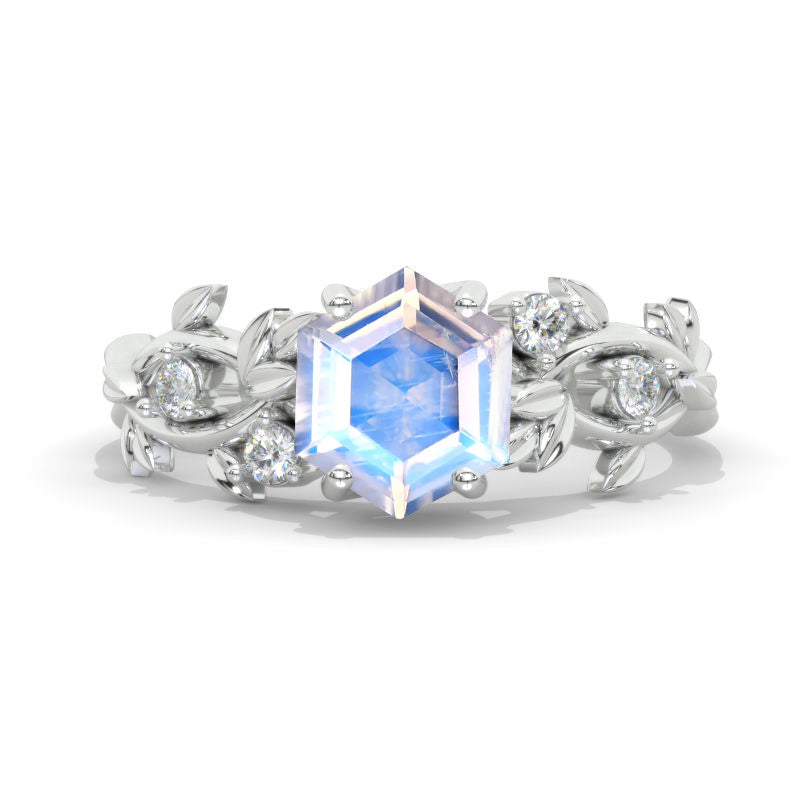 3 Carat Hexagon Genuine Moonstone Floral Twig 14K White Gold Engagemen - Giliarto