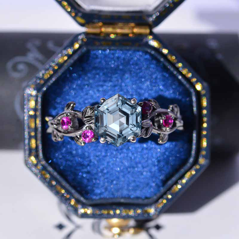3 Carat Hexagon Genuine Natural Aquamarine Floral 14K Black Gold Engag - Giliarto