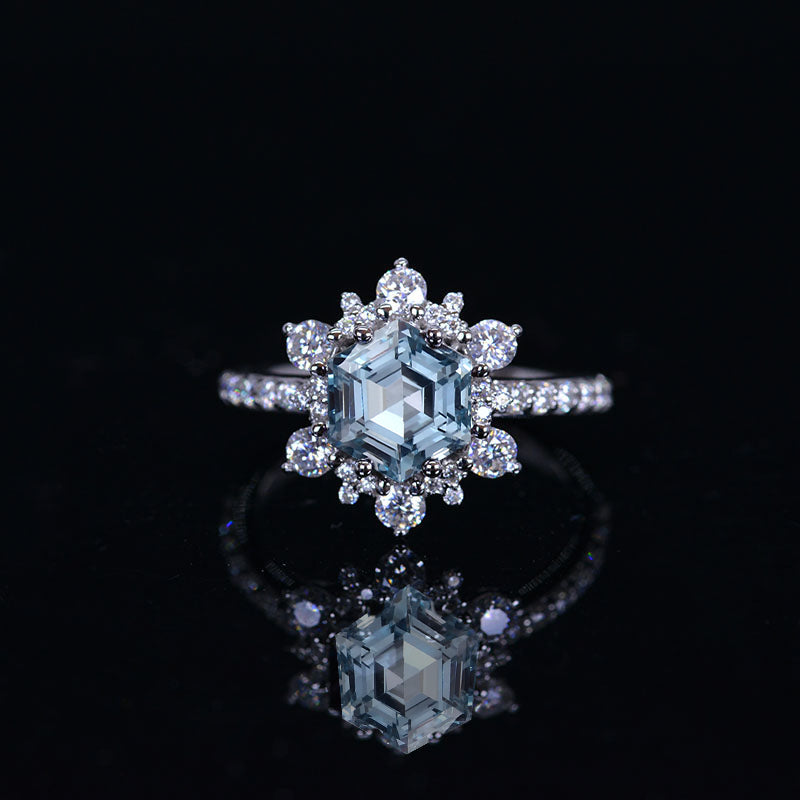 3 Carat Hexagon Genuine Natural Aquamarine Snowflake Halo Engagement R - Giliarto