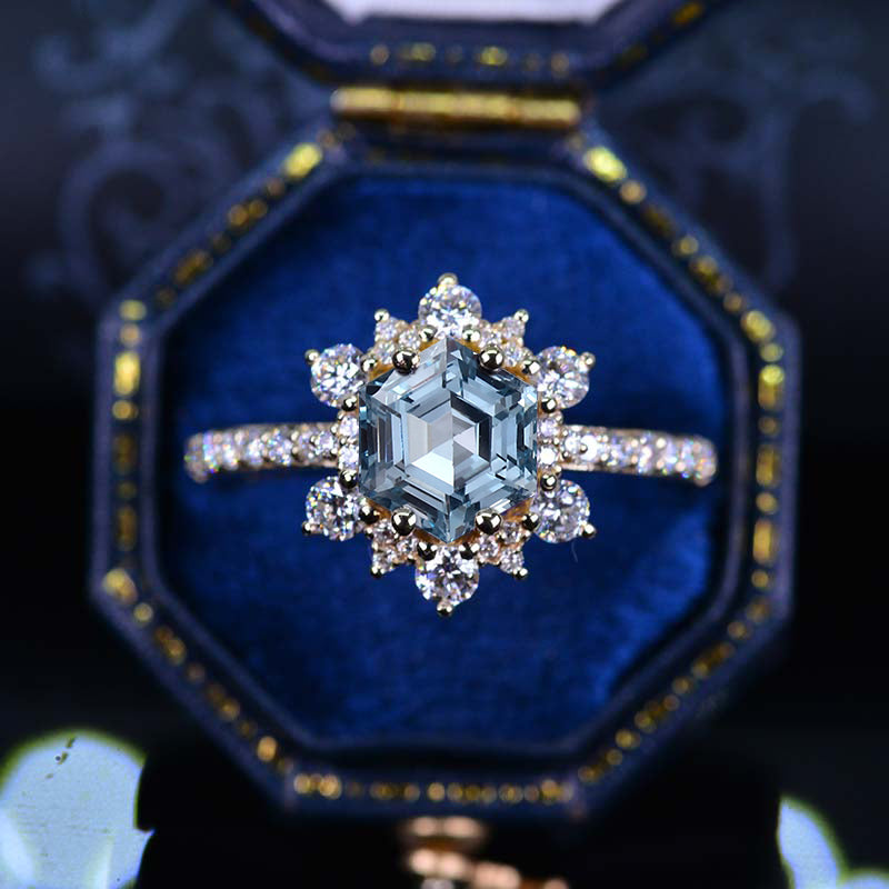 The default design option features 8mm Hexagon Cut Genuine Natural Aquamarine Stone, VG-Cut, Ex-Polish, VG-Symmetry with 0.6 C.T.W.   Moissanite Accent Stones