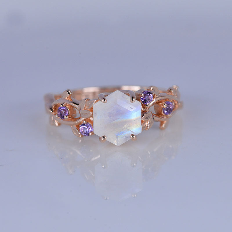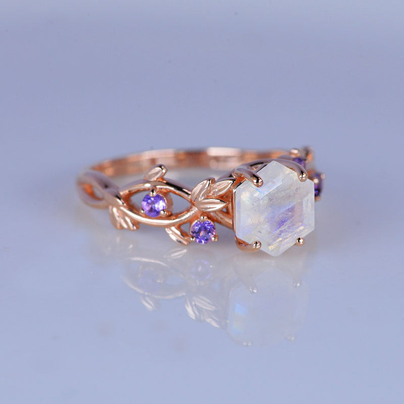 3 Carat Hexagon Genuine Natural Moonstone Floral 14K Rose Gold Engagem - Giliarto