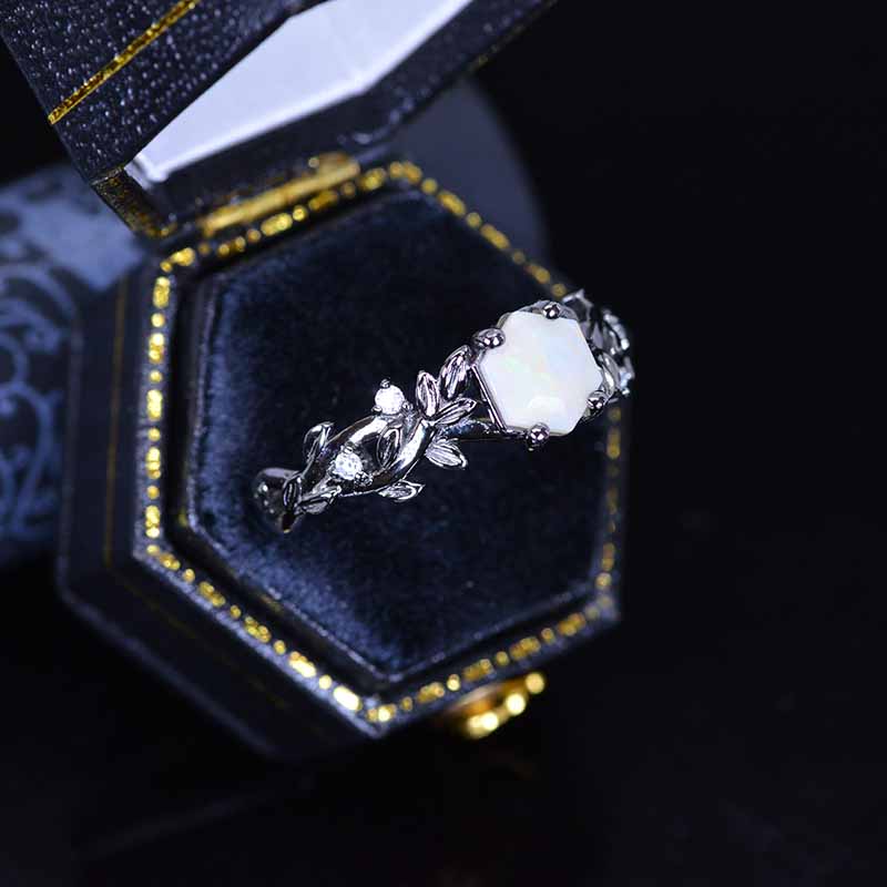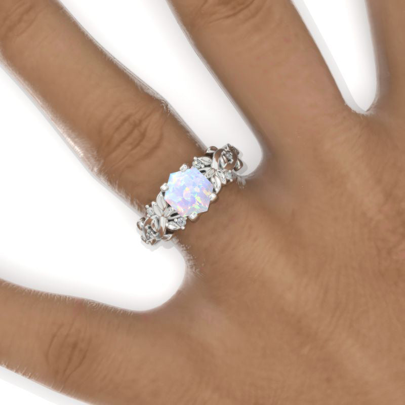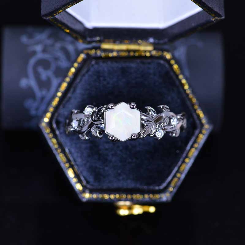 3 Carat Hexagon Genuine Natural White Opal Floral 14K Black Gold Engag - Giliarto